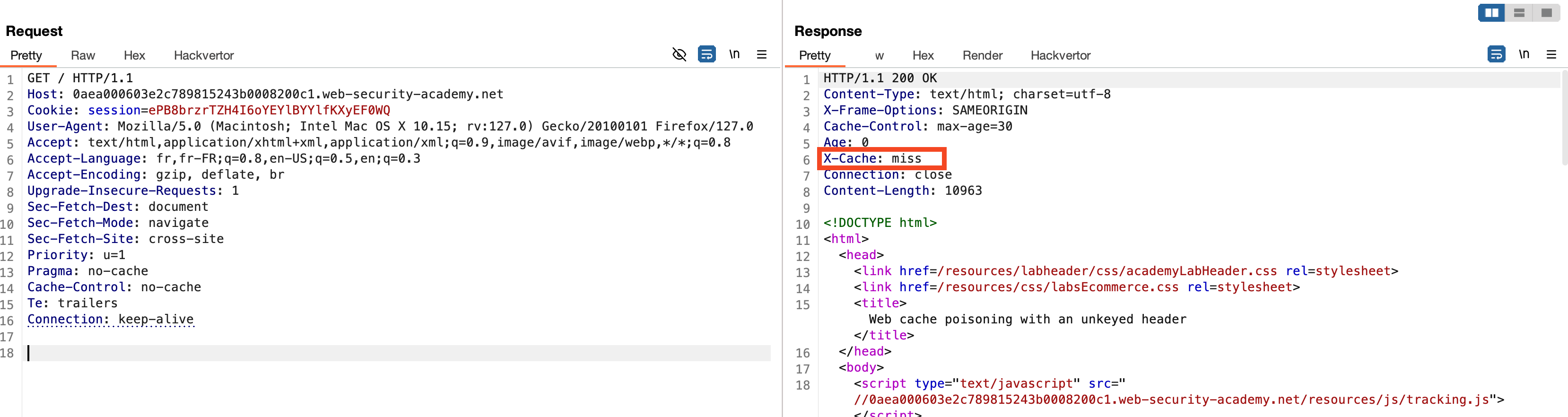 In this example, the geolocate.js JavaScript file with the parameter callback=setCountryCookie is cached by the remote server and loaded from the website. When testing by modifying the value of the callback parameter, we notice that it is part of the cache key (indicated by X-Cache: miss when the value is changed).