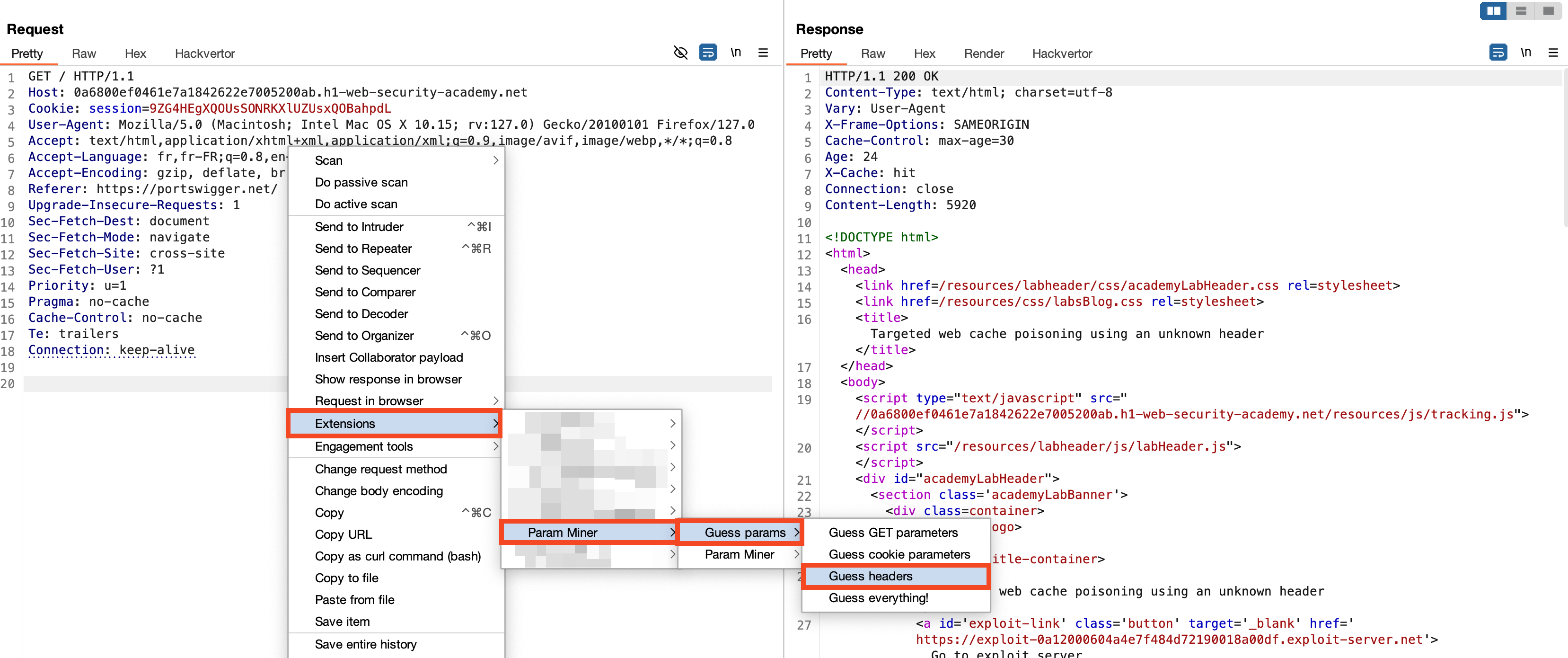 In this third scenario, we will fuzz the headers to see if the server responds differently based on the headers. To achieve this, we will use the Param Miner extension from PortSwigger, which automates the process of discovering hidden parameters and headers that affect the application's behavior.